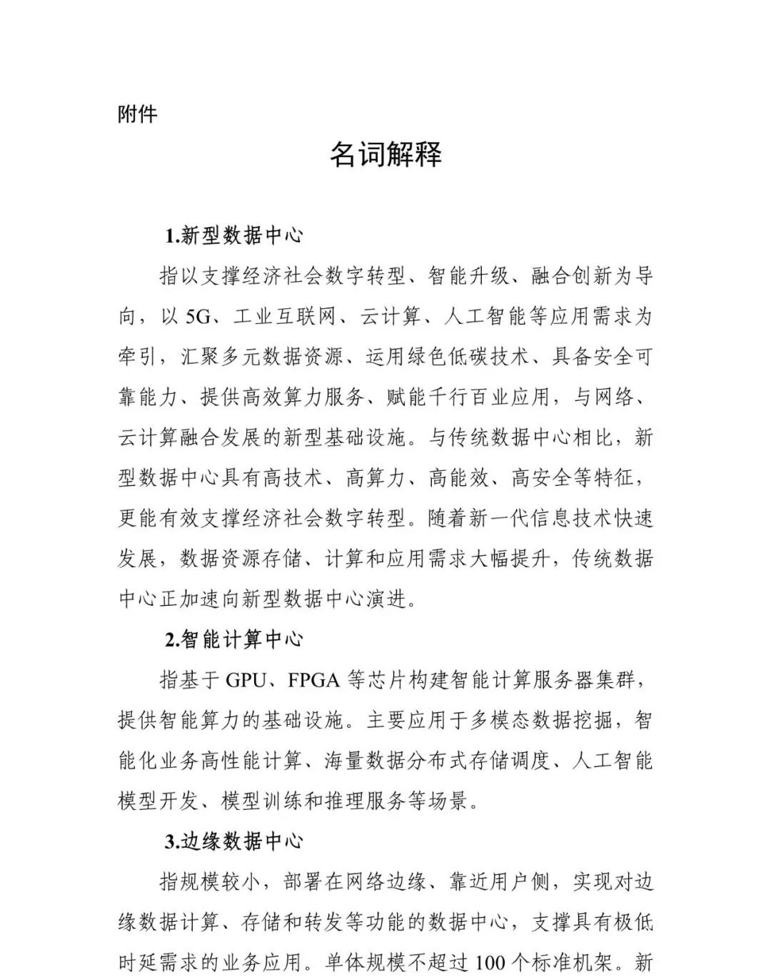 新型數(shù)據(jù)中心發(fā)展三年行動計劃 新型數(shù)據(jù)中心是以支撐經(jīng)濟社會數(shù)字轉型、智能升級、融合創(chuàng)新為導向,以5G、工業(yè)互聯(lián)網(wǎng)、云計算、人工智能等應用需求為牽引,匯聚多元數(shù)據(jù)資源、運用綠色低碳技術、具備安全可靠能力、提供高效算力服務、賦能千行百業(yè)應用的新型基礎設施,具有高技術、高算力、高能效、高安全特征。隨著新一代信息技術快速發(fā)展,數(shù)據(jù)資源存儲、計算和應用需求大幅提升,傳統(tǒng)數(shù)據(jù)中心正加速與網(wǎng)絡、云計算融合發(fā)展,加快向新型數(shù)據(jù)中心演進。為統(tǒng)籌推進新型數(shù)據(jù)中心發(fā)展,構建以新型數(shù)據(jù)中心為核心的智能算力生態(tài)體系,發(fā)揮對數(shù)字經(jīng)濟的賦能和驅動作用,制定本行動計劃。 以習近平新時代中國特色社會主義思想為指導,全面貫徹黨的十九大和十九屆二中、三中、四中、五中全會精神,把握新發(fā)展階段、貫徹新發(fā)展理念、構建新發(fā)展格局,以賦能數(shù)字經(jīng)濟發(fā)展為目標,推動新型數(shù)據(jù)中心建設布局優(yōu)化、網(wǎng)絡質量提升、算力賦能加速、產(chǎn)業(yè)鏈穩(wěn)固增強、綠色低碳發(fā)展、安全保障提高,打造新型智能算力生態(tài)體系,有效支撐各領域數(shù)字化轉型,為經(jīng)濟社會高質量發(fā)展提供新動能。 統(tǒng)籌協(xié)調,均衡有序。堅持系統(tǒng)觀念,統(tǒng)籌存量和增量,加強數(shù)據(jù)中心規(guī)劃協(xié)調,避免低質量、粗放型建設發(fā)展。提升數(shù)據(jù)中心整體利用率,實現(xiàn)全國數(shù)據(jù)中心科學布局、有序發(fā)展。 需求牽引,深化協(xié)同。堅持市場需求導向,建用并舉。推動新型數(shù)據(jù)中心與網(wǎng)絡協(xié)同建設,推進新型數(shù)據(jù)中心集群與邊緣數(shù)據(jù)中心協(xié)同聯(lián)動,促進算力資源協(xié)同利用,加強國際國內數(shù)據(jù)中心協(xié)同發(fā)展。 分類引導,互促互補。堅持多元主體共建原則,鼓勵不同主體在新型數(shù)據(jù)中心建設運營中發(fā)揮各自優(yōu)勢,推動基礎電信企業(yè)強化網(wǎng)絡等基礎設施建設,引導第三方數(shù)據(jù)中心企業(yè)提供差異化、特色化服務,支持互聯(lián)網(wǎng)企業(yè)創(chuàng)新行業(yè)應用。 創(chuàng)新驅動,產(chǎn)業(yè)升級。堅持產(chǎn)業(yè)基礎高級化和產(chǎn)業(yè)鏈現(xiàn)代化,加強新型數(shù)據(jù)中心核心技術研發(fā),推動產(chǎn)業(yè)鏈協(xié)同創(chuàng)新,育龍頭、筑基礎、強集群,促進產(chǎn)業(yè)發(fā)展水平和服務能力不斷提升。 綠色低碳,安全可靠。堅持綠色發(fā)展理念,支持綠色技術、綠色產(chǎn)品、清潔能源的應用,全面提高新型數(shù)據(jù)中心能源利用效率。統(tǒng)籌發(fā)展與安全,進一步強化網(wǎng)絡和數(shù)據(jù)安全管理和能力建設,構建完善的安全保障體系。 用3年時間,基本形成布局合理、技術先進、綠色低碳、算力規(guī)模與數(shù)字經(jīng)濟增長相適應的新型數(shù)據(jù)中心發(fā)展格局。總體布局持續(xù)優(yōu)化,全國一體化算力網(wǎng)絡國家樞紐節(jié)點(以下簡稱國家樞紐節(jié)點)、省內數(shù)據(jù)中心、邊緣數(shù)據(jù)中心梯次布局。技術能力明顯提升,產(chǎn)業(yè)鏈不斷完善,國際競爭力穩(wěn)步增強。算力算效水平顯著提升,網(wǎng)絡質量明顯優(yōu)化,數(shù)網(wǎng)、數(shù)云、云邊協(xié)同發(fā)展。能效水平穩(wěn)步提升,電能利用效率(PUE)逐步降低,可再生能源利用率逐步提高。 到2021年底,全國數(shù)據(jù)中心平均利用率力爭提升到55%以上,總算力超過120 EFLOPS,新建大型及以上數(shù)據(jù)中心PUE降低到1.35以下。 到2023年底,全國數(shù)據(jù)中心機架規(guī)模年均增速保持在20%左右,平均利用率力爭提升到60%以上,總算力超過200 EFLOPS,高性能算力占比達到10%。國家樞紐節(jié)點算力規(guī)模占比超過70%。新建大型及以上數(shù)據(jù)中心PUE降低到1.3以下,嚴寒和寒冷地區(qū)力爭降低到1.25以下。國家樞紐節(jié)點內數(shù)據(jù)中心端到端網(wǎng)絡單向時延原則上小于20毫秒。 (一)新型數(shù)據(jù)中心建設布局優(yōu)化行動 1.加快建設國家樞紐節(jié)點。推動京津冀、長三角、粵港澳大灣區(qū)、成渝等國家樞紐節(jié)點適當加快新型數(shù)據(jù)中心集群建設進度,實現(xiàn)大規(guī)模算力部署,滿足重大區(qū)域發(fā)展戰(zhàn)略實施需要;貴州、內蒙古、甘肅、寧夏等國家樞紐節(jié)點重點提升算力服務品質和利用效率,打造面向全國的非實時性算力保障基地。 2.按需建設各省新型數(shù)據(jù)中心。國家樞紐節(jié)點以外的地區(qū),著力整合并充分利用現(xiàn)有數(shù)據(jù)中心資源,加快提高存量數(shù)據(jù)中心利用率。面向本地區(qū)業(yè)務需求,結合能源供給、網(wǎng)絡條件等實際,按需適度建設新型數(shù)據(jù)中心,打造具有地方特色、服務本地、規(guī)模適度的算力服務。 3.靈活部署邊緣數(shù)據(jù)中心。積極構建城市內的邊緣算力供給體系,支撐邊緣數(shù)據(jù)的計算、存儲和轉發(fā),滿足極低時延的新型業(yè)務應用需求。引導城市邊緣數(shù)據(jù)中心與變電站、基站、通信機房等城